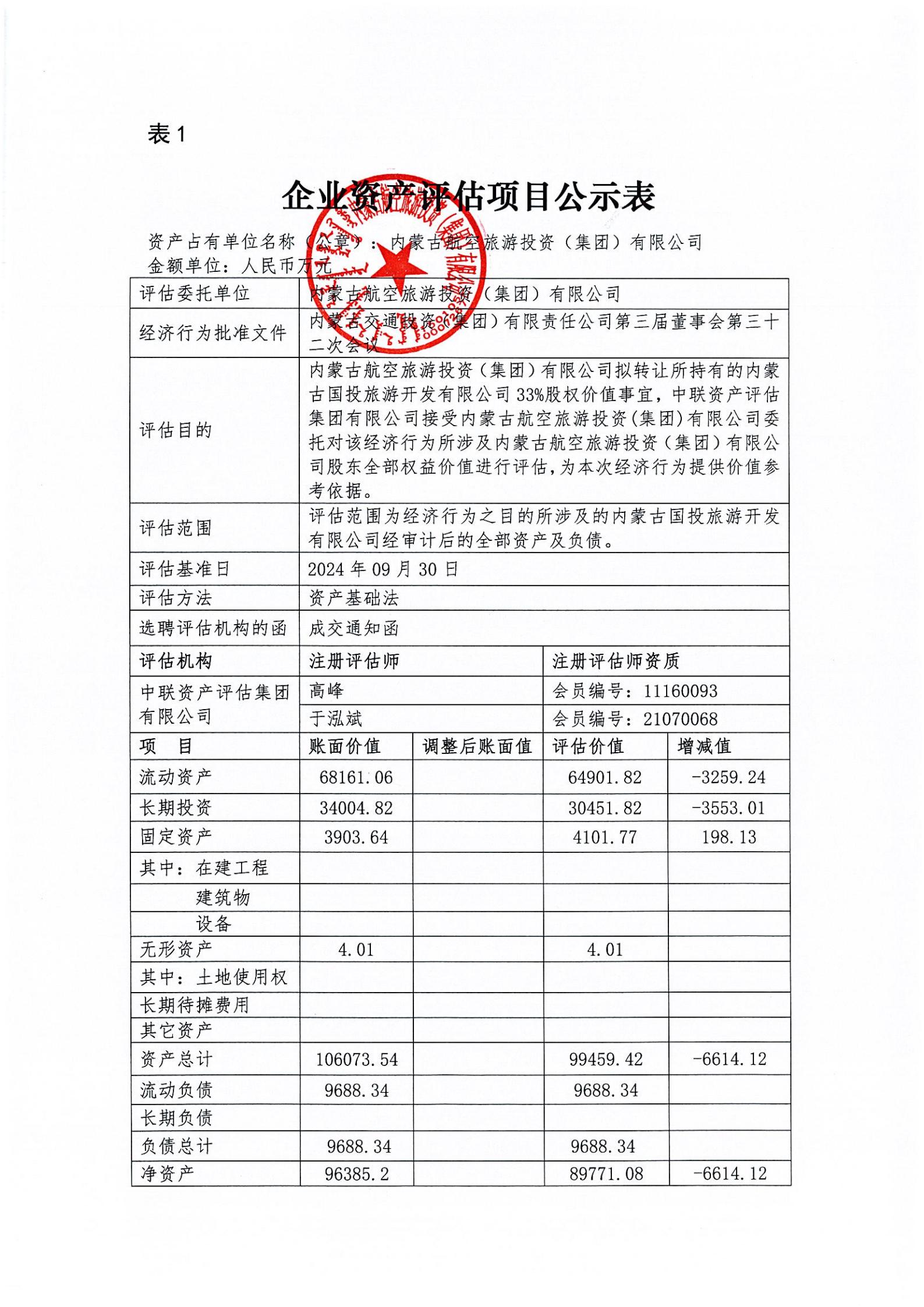 根據(jù)《內(nèi)蒙古自治區(qū)區(qū)屬企業(yè)國(guó)有資產(chǎn)評(píng)估項(xiàng)目公示辦法》《內(nèi)蒙古交通投資(集團(tuán))有限責(zé)任公司國(guó)有資產(chǎn)評(píng)估管理辦法(試行)》相關(guān)規(guī)定,為依法合規(guī)開(kāi)展我公司國(guó)有資產(chǎn)評(píng)估行為,建立有效監(jiān)督機(jī)制,做到國(guó)有資產(chǎn)評(píng)估管理工作規(guī)則公開(kāi)、過(guò)程公開(kāi)、結(jié)果公開(kāi),依法保障資產(chǎn)評(píng)估項(xiàng)目相關(guān)各方知情權(quán)和監(jiān)督權(quán),現(xiàn)將內(nèi)蒙古航旅集團(tuán)擬轉(zhuǎn)讓所持內(nèi)蒙古國(guó)投旅游公司33%股權(quán)價(jià)值所涉及內(nèi)蒙古航旅集團(tuán)全部權(quán)益價(jià)值資產(chǎn)評(píng)估結(jié)果進(jìn)行公示,公示內(nèi)容詳見(jiàn)附表。公示有效期:2024年12月11日-12月17日。